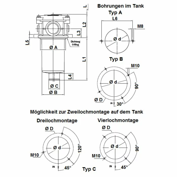 Фильтр обратного потока для монтажа в крышку бака, размеры для